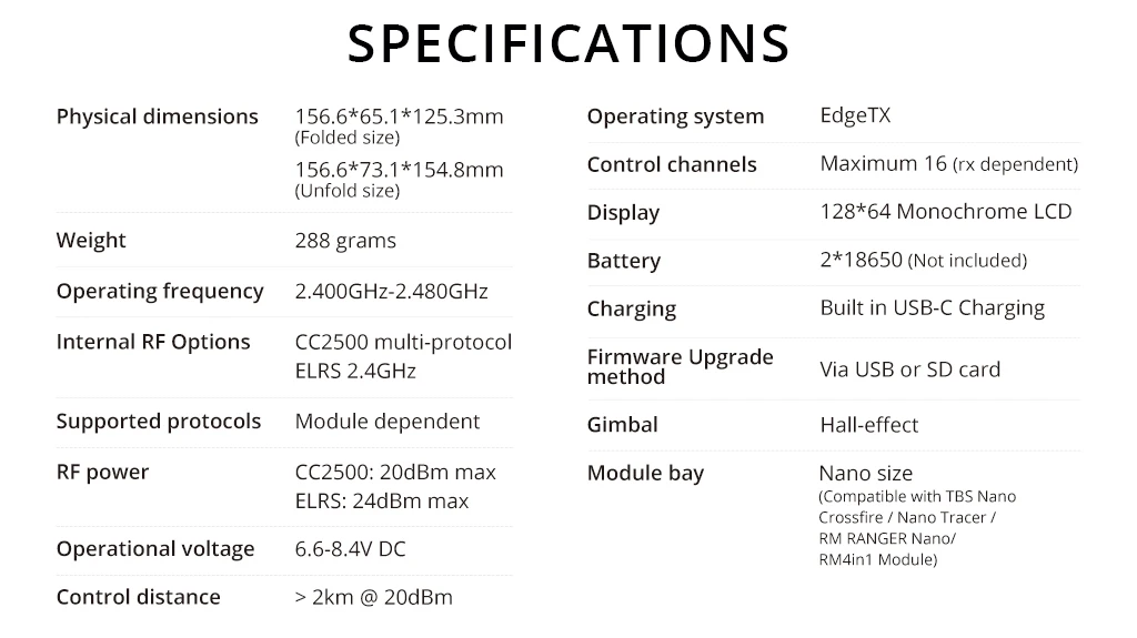 Control remoto Radiomaster Pocket Especificaciones Artículo: Pocket Radio Dimensiones físicas: 156,6*65,1*125,3mm (tamaño plegado)/156,6*73,1*154,8mm (tamaño desplegado) Peso: 288 gramos Frecuencia de funcionamiento: 2.400GHz-2.480GHz Opciones internas de RF: CC2500 multi-Protocolo/ELRS 2,4 GHz Protocolos soportados: Dependiente del módulo Potencia de RF: CC2500:100MW Max (20dBm) / ELRS FCC: 250MW Max (24dBm) / ELRS EU-LBT: 100MW Max (20dBm) Voltaje operacional: 6,6-8,4 V DC Distancia de control:> 2km @ 20dBm Sistema operativo: EdgeTX Canales de control: máximo 16 (dependiente del receptor) Pantalla: 128*64 LCD monocromo Batería: 2 piezas 18650 baterías (no incluidas) Recomendado para usar 18650 2500mAh-3000mAh baterías de punta Carga: construido en USB-C QC3 carga Firmware actualizable: A Través De USB o la tarjeta SD incluida Gimbal: efecto Hall Bahía del módulo: tamaño nano (compatible con los módulos de tamaño nano RadioMaster, TBS Nano Crossfire / Nano Tracer) Paquete incluyendo: 1 * Radio de bolsillo 1 * Custom Carry Pouch 1 * Cable USB-C 1 * Protector de pantalla 1 * pegatina 4 * resortes de baja tensión 1 * Manual ESPECIFICACIONES 1 Marca: BAYCK Modelo LV: ELRS 2,4G NANO RB RF Freq: 2,4 Ghz OE IC:SX1281 + ESP8285 Potencia de TW TX: 100mW Hit Color: Negro Conector PUR: IPEX 1 Potencia de entrada BF: 3,6-5,5 V Peso: 0,4g (receptor solamente) Tamaño del hex: 11mm * 18mm Firmware DE LA UNIDAD: BETAFPV Nano 2400 RX 2.2.0