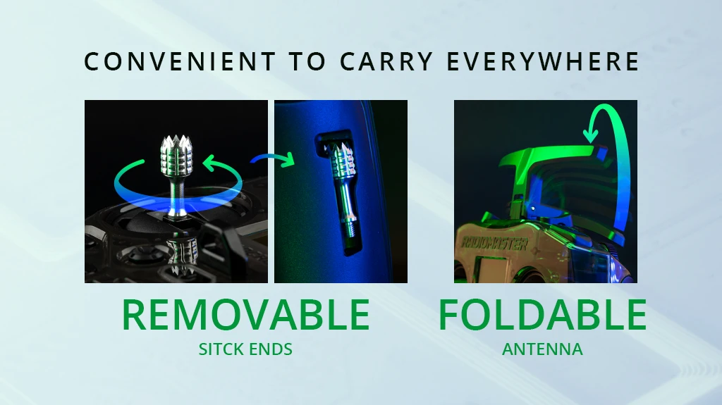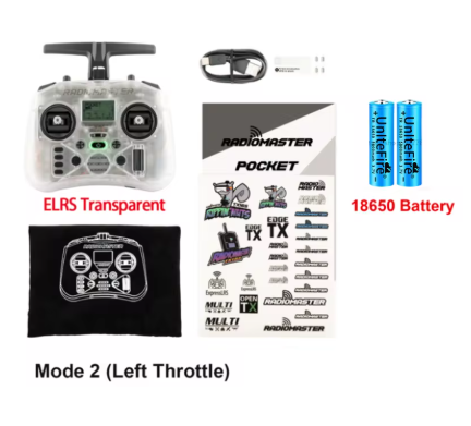RadioMaster Pocket es una radio pequeña y liviana que tiene un gran impacto.Está disponible en dos versiones, ExpressLRS y MPM CC2500, y ambas versiones vienen preinstaladas con el firmware EdgeTX.El Pocket también está equipado con extremos de palo extraíbles y una antena plegable, lo que facilita su transporte y almacenamiento.Es compatible con baterías 18650, que brindan una batería de larga duración para horas de diversión.